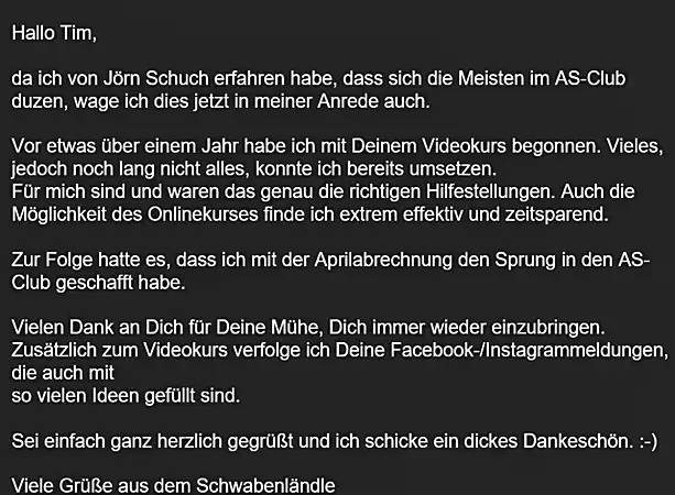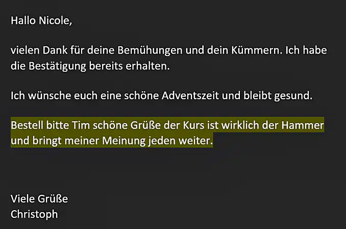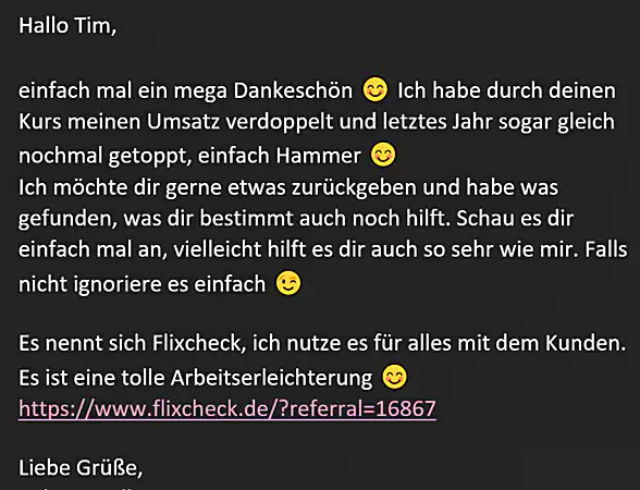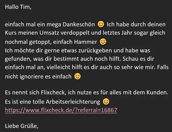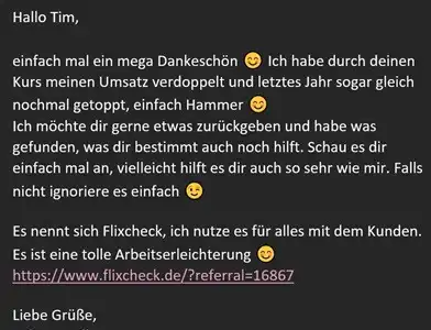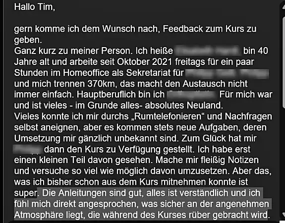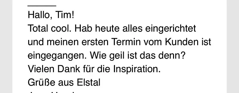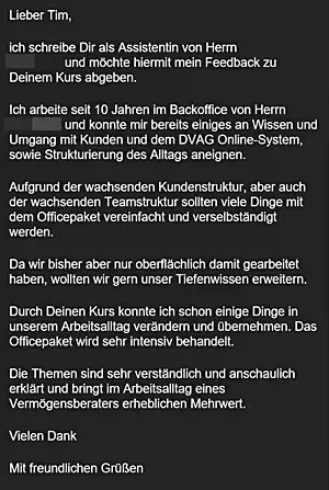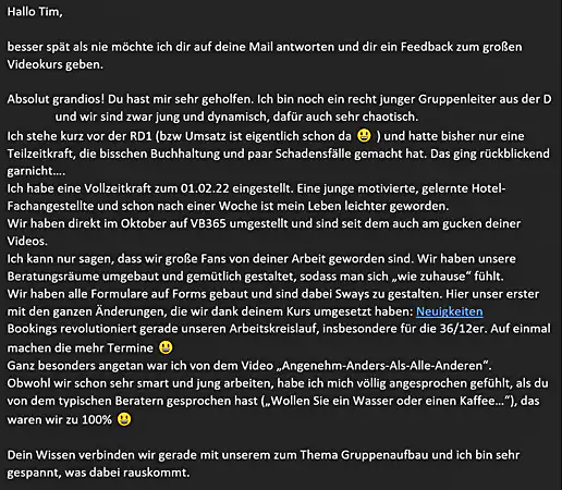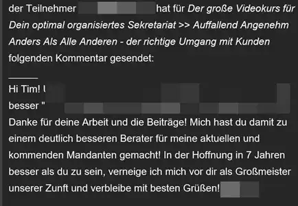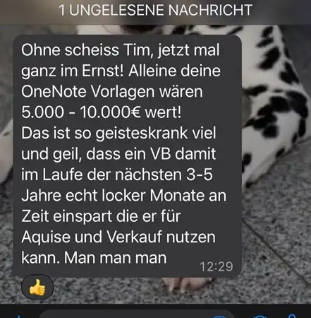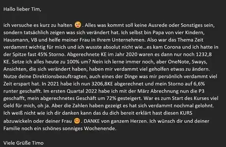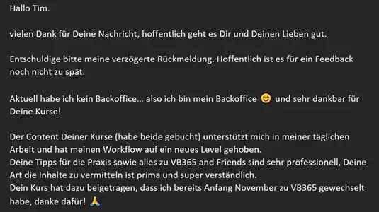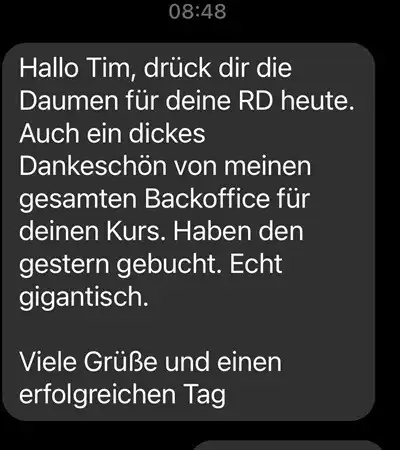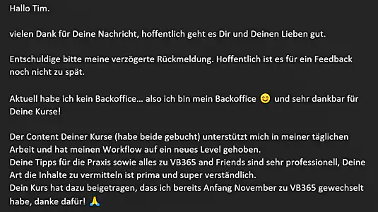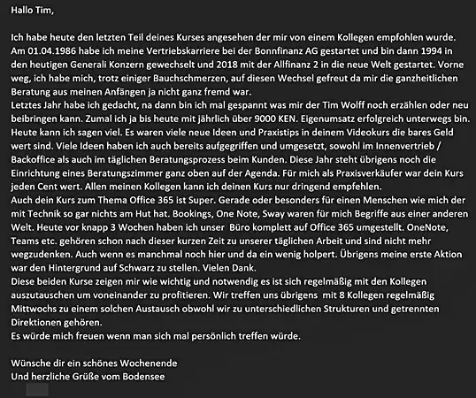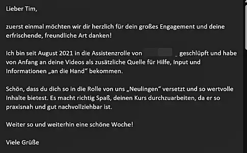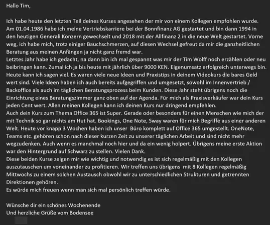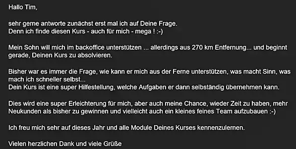 Der Kurs hat über 30 Stunden puren Inhalt - vermutlich braucht man live mehr als 100 Stunden. Nutze diese 100 Stunden und schreib Umsatz - das bringt Dir ein vielfaches von dem, was der Kurs kostet! - Du willst, dass Tim Wolff Dein Backoffice einarbeitet? 😉