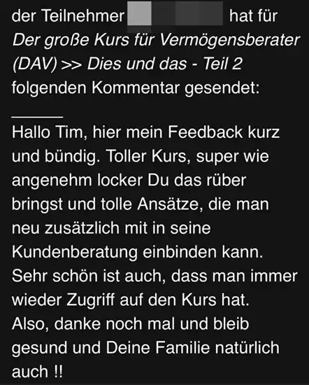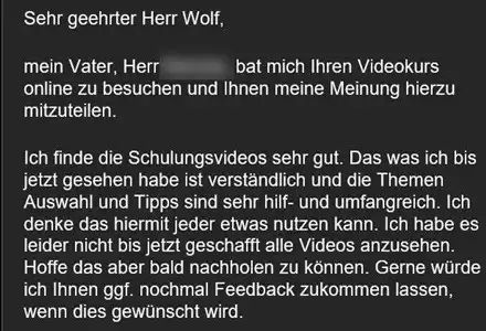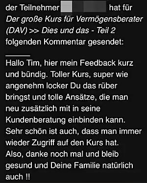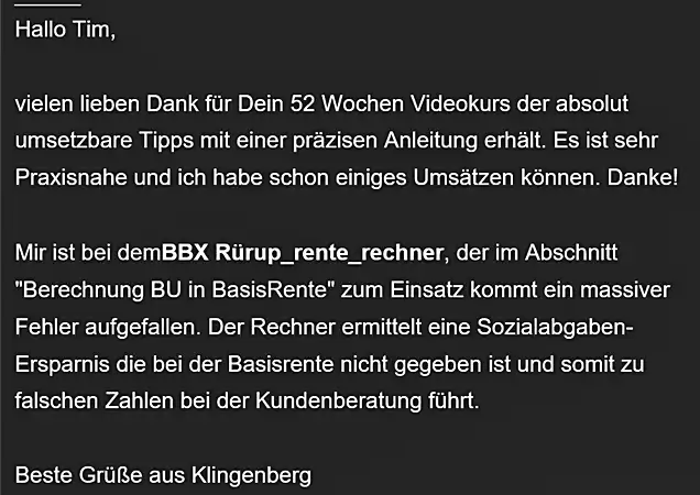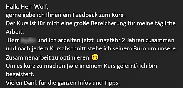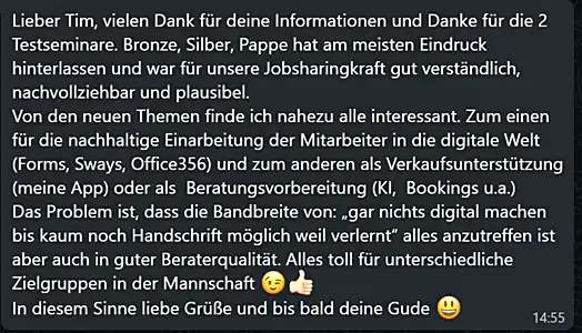 Die meisten von uns starten im persönlichen Umfeld. Umso wichtiger, dass Du hier keine Fehler machst und Deine Beratungsqualität von Beginn an spitze ist. Daher ist 'schnelles Lernen' besonders wichtig! - Wording ist in unseren Beruf entscheidend!