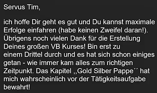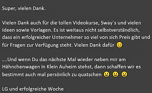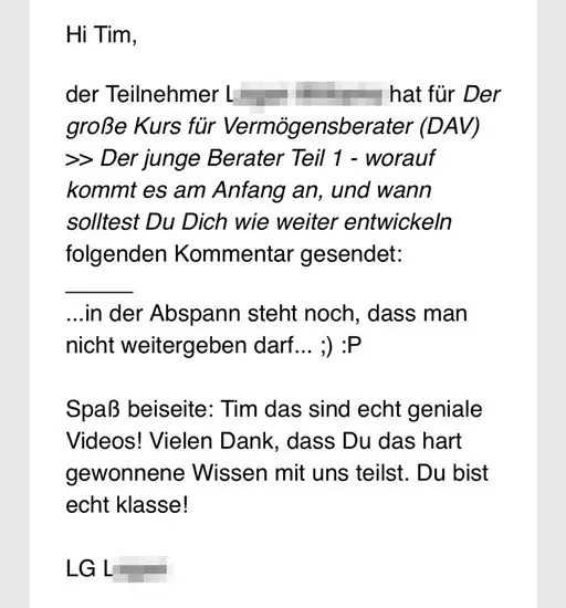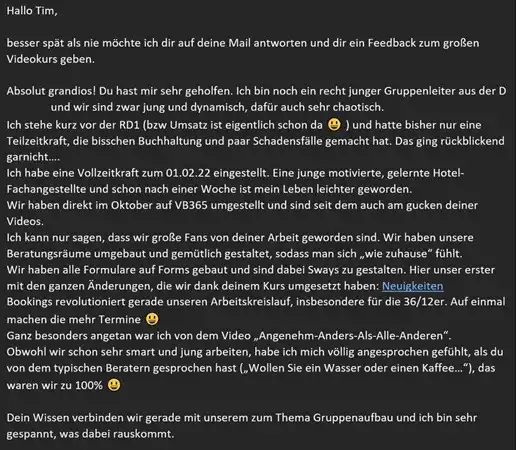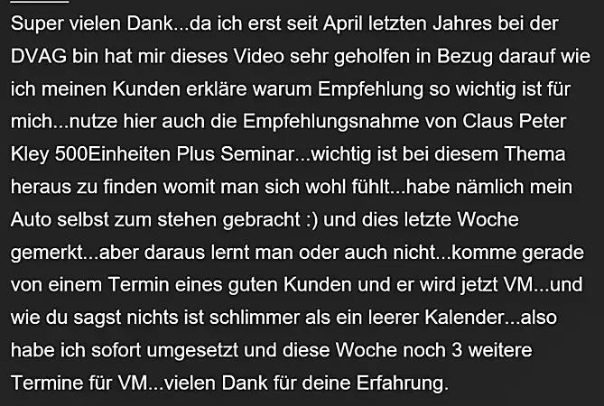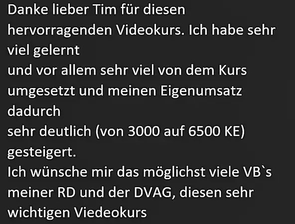 Sportprofis schauen sich Videos ihrer Gegner an um deren Spiel zu analysieren. Weil man es immer wieder aus verschiedenen Perspektiven sehen kann. So ähnlich ist das hier: Du kannst die für Dich wichtigen Stellen immer und immer wieder anschauen und dadurch effizienter und effektiver lernen. - Du bist junger VB und willst Deine Abschluss- und Terminquoten verbessern!
