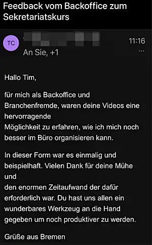 Ein Sekretariat ist oft der erste Kontaktpunkt des Kunden. Natürlich sollte Freundlichkeit Usus sein. Aber was nützt ein besonders freundliches Wesen, wenn die Arbeit ewig dauert. Dieser Kurs löst dieses Problem! - Du hast keine Zeit/Lust, dein Backoffice selbst einzuarbeiten?